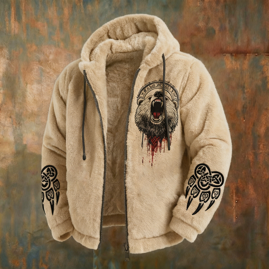 Men's Viking Tribal Jacquard Celtic With Bear Inspired Plush Warm Zipped Hooded Jacket
