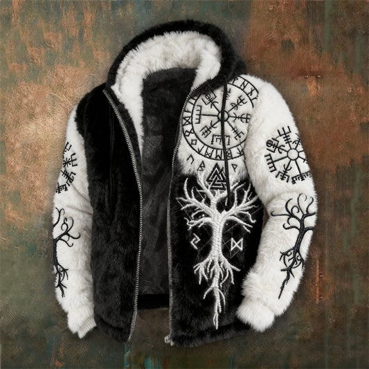 Men's Viking Tribal Jacquard Celtic Knot Plush Warm Zipped Hooded Jacket