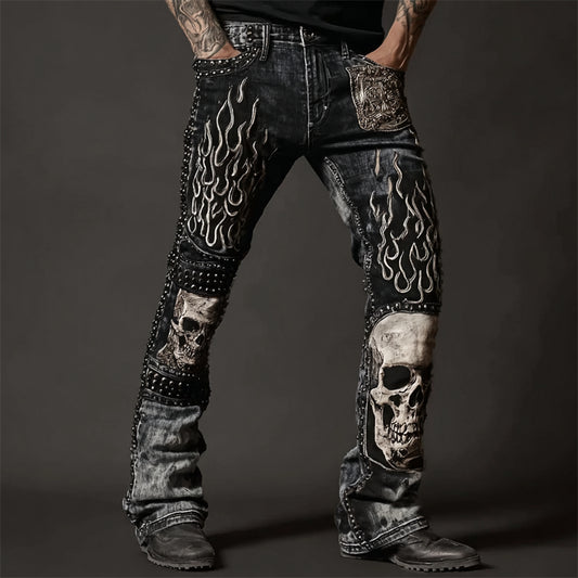 Men's Skulls On Flame Rock Style Studded Washed Jeans