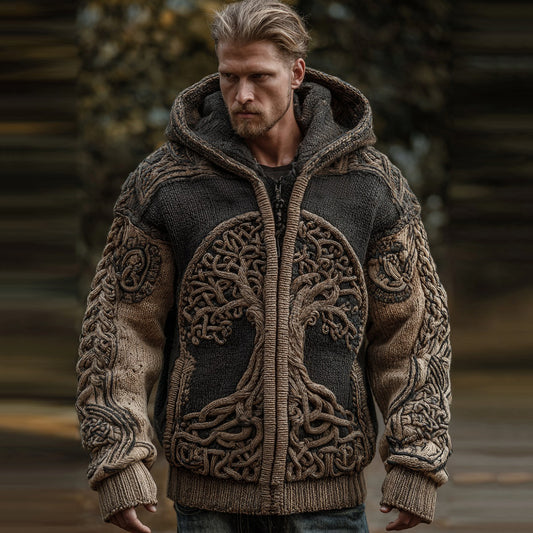 Men's Viking Tree Of Life Celtic Art Knit Hooded Zip-up Sweater