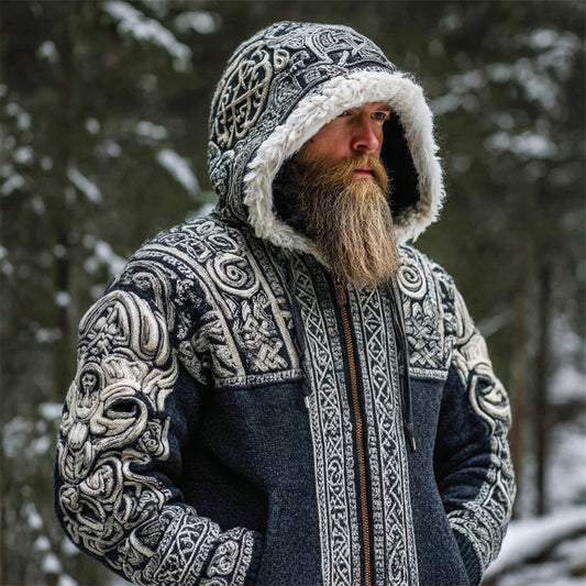 Men's Viking Wolf Style Celtic Thick Zip Hooded Sweater