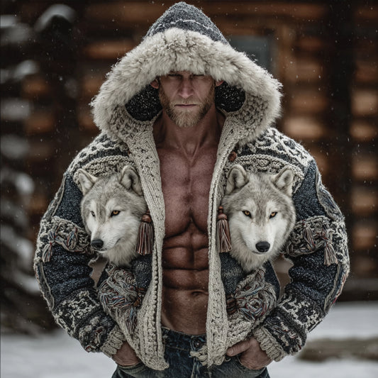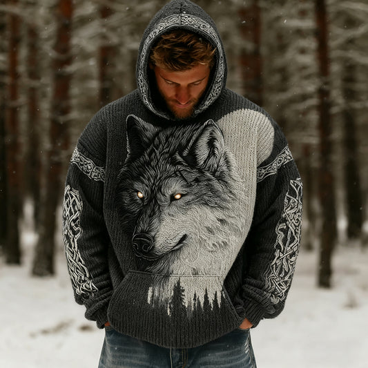 Men's Viking Wolf Totem Knitted Hooded Sweater