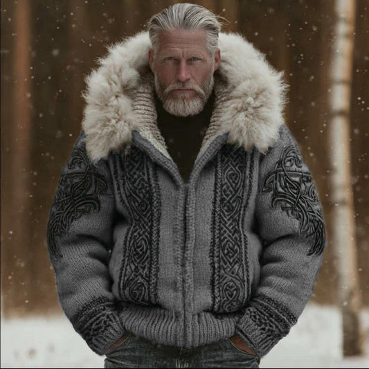 Men's Viking Celtic Art Cozy Fur Collar Knit Hooded Sweater Jacket