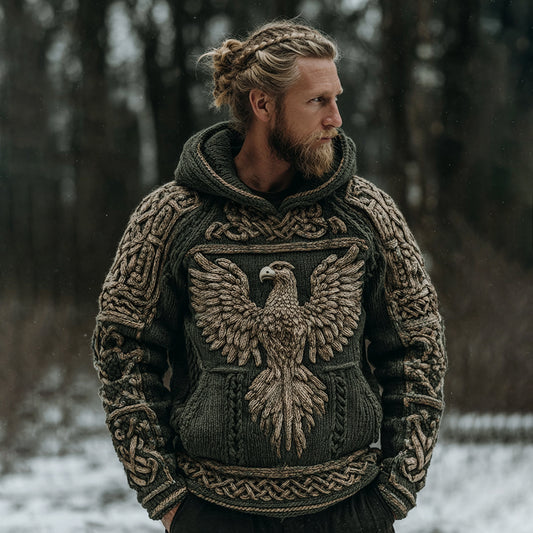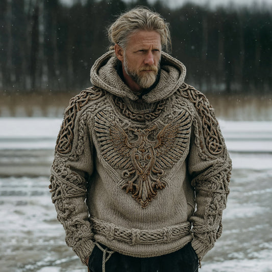 Men's Vintage Viking Celtic Knot Eagle Knit Hooded Sweater