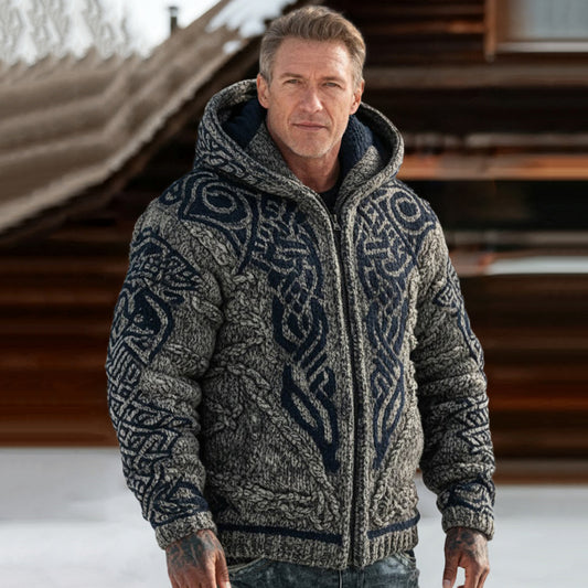Men's Vintage Viking Celtic Knot Art Chunky Knit Hooded Zip-up Sweater
