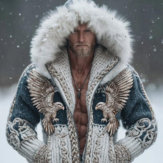 Men's Viking Christmas Eagle Pattern Cozy Knit Zip Up Hooded Sweater