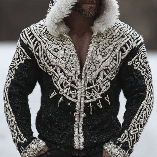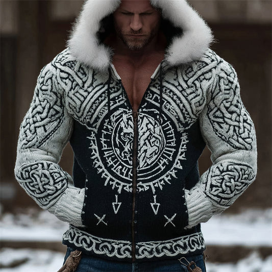 Men's Viking Totem Celtic Contrast Cozy Fur Trim Hooded Cardigan